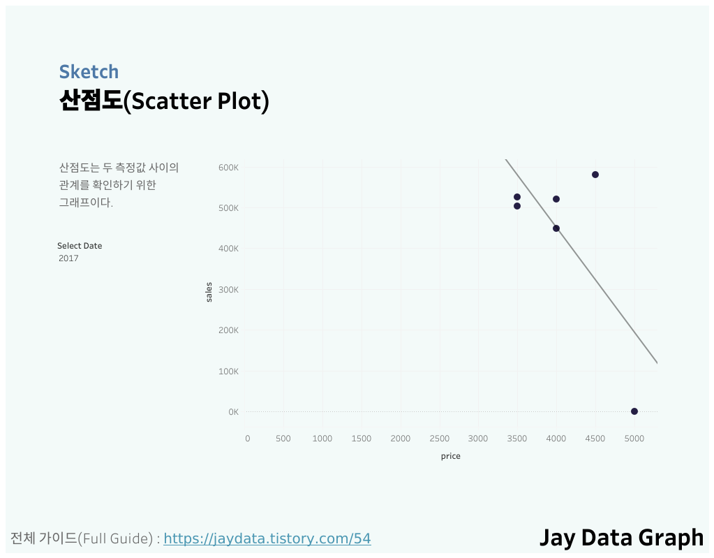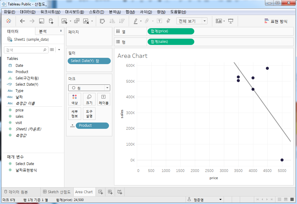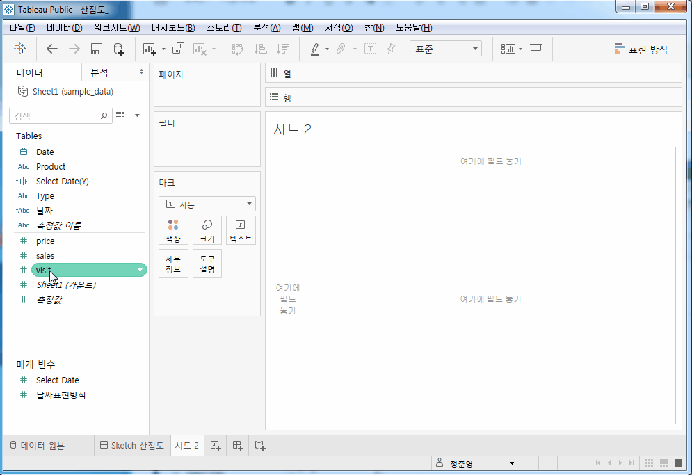 Date Type Product Price Visit Sales 2017-12-31 핫 라떼 4000 132 528000 2017-12-31 핫 아메리카노 3500 117 409500 2017-12-31 아이스 아이스 라떼 4000 145 580000 2017-12-31 아이스 아이스 아메리카노 3500 118 413000 2017-12-31 아이스 포도 주스 4500 133 598500 2017-12-31 아이스 수박 주스 5000 0 0 2018-01-31 핫 라떼 4000 150 600000 2018-01-31 핫 아메리카노 3500 121 423500 2018-01-31 아이스 아이스 라떼 4000 123 492000 2018-01-31 아이스 아이스 아메리카노 3500 111 388500 2018-01-31 아이스 포도 주스 4500 146 657000 2018-01-31 아이스 수박 주스 5000 0 0 Tableau에서 산점도 시각화하기