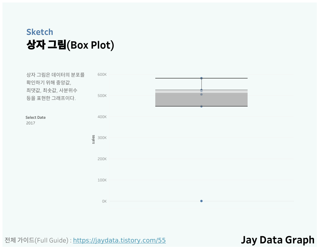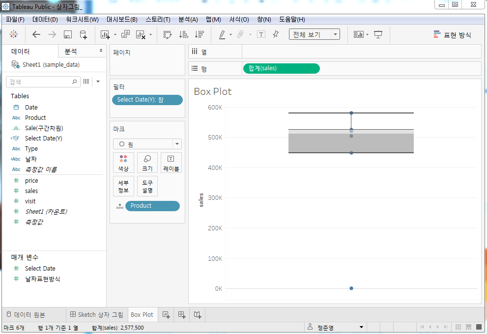 Date Type Product Price Visit Sales 2017-12-31 핫 라떼 4000 132 528000 2017-12-31 핫 아메리카노 3500 117 409500 2017-12-31 아이스 아이스 라떼 4000 145 580000 2017-12-31 아이스 아이스 아메리카노 3500 118 413000 2017-12-31 아이스 포도 주스 4500 133 598500 2017-12-31 아이스 수박 주스 5000 0 0 2018-01-31 핫 라떼 4000 150 600000 2018-01-31 핫 아메리카노 3500 121 423500 2018-01-31 아이스 아이스 라떼 4000 123 492000 2018-01-31 아이스 아이스 아메리카노 3500 111 388500 2018-01-31 아이스 포도 주스 4500 146 657000 2018-01-31 아이스 수박 주스 5000 0 0 Tableau에서 상자 그림 시각화하기