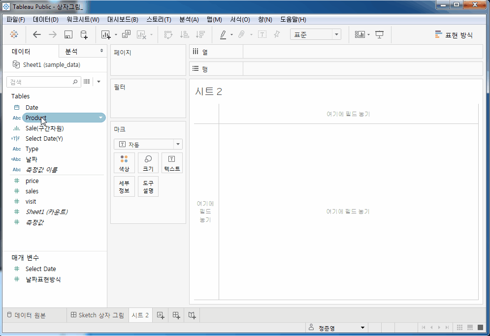 3. 데이터 패널이 있는 Product 차원을 마크 패널의 세부 정보로, Sale 측정값을 행으로 드래그한다. 표현 방식에서 상자 그림(박스 플롯)을 선택하면 막대 그래프가 상자 그림으로 바뀐다.