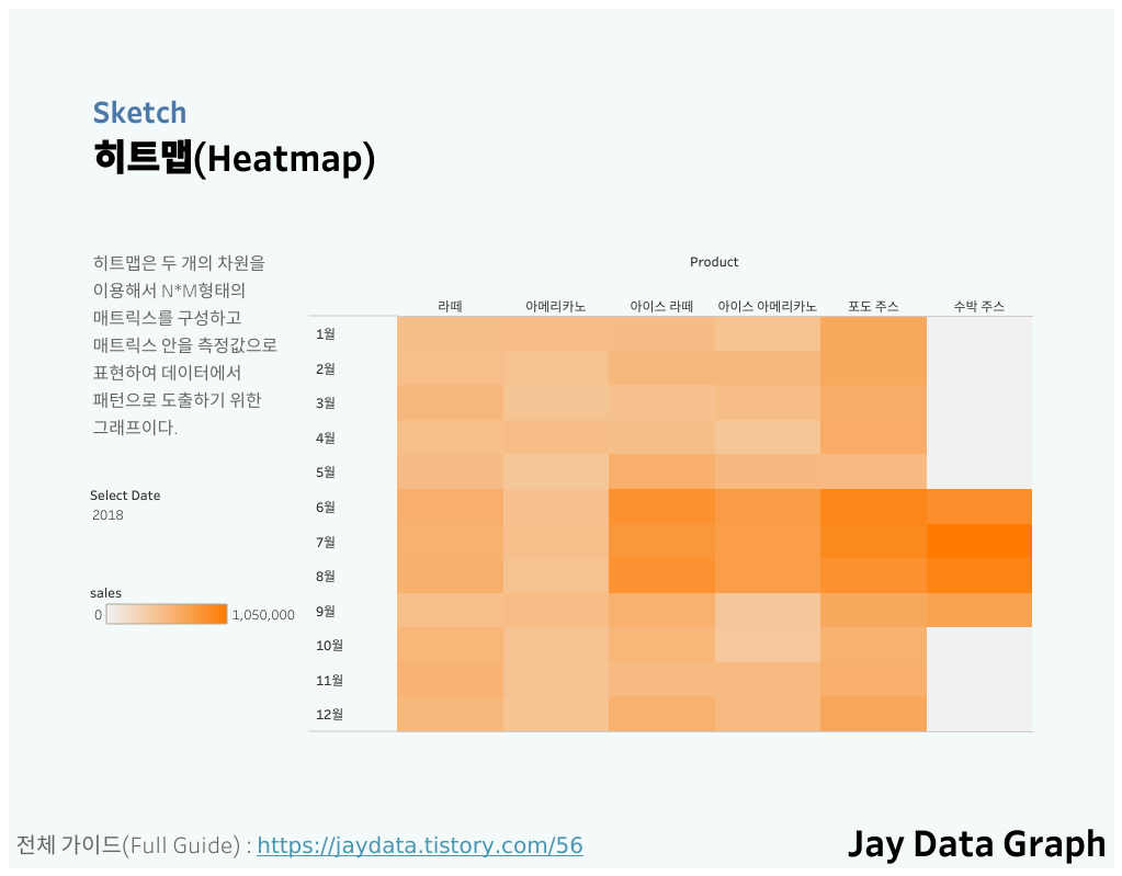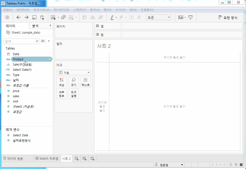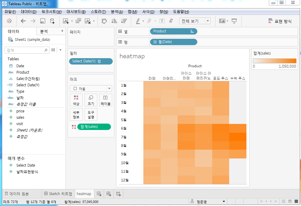 Date Type Product Price Visit Sales 2017-12-31 핫 라떼 4000 132 528000 2017-12-31 핫 아메리카노 3500 117 409500 2017-12-31 아이스 아이스 라떼 4000 145 580000 2017-12-31 아이스 아이스 아메리카노 3500 118 413000 2017-12-31 아이스 포도 주스 4500 133 598500 2017-12-31 아이스 수박 주스 5000 0 0 2018-01-31 핫 라떼 4000 150 600000 2018-01-31 핫 아메리카노 3500 121 423500 2018-01-31 아이스 아이스 라떼 4000 123 492000 2018-01-31 아이스 아이스 아메리카노 3500 111 388500 2018-01-31 아이스 포도 주스 4500 146 657000 2018-01-31 아이스 수박 주스 5000 0 0 Tableau에서 히트맵 시각화하기