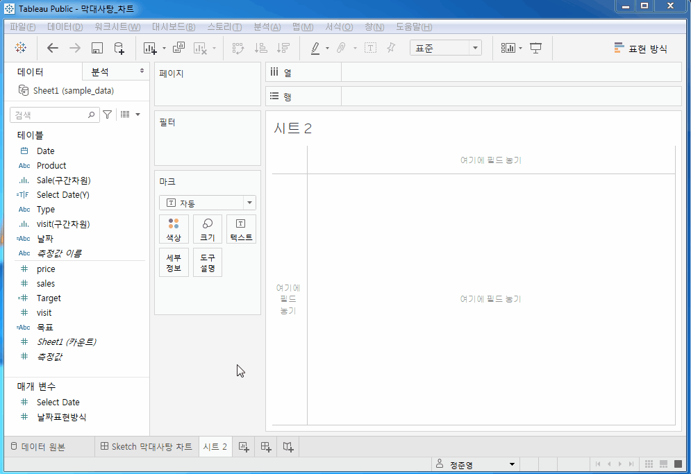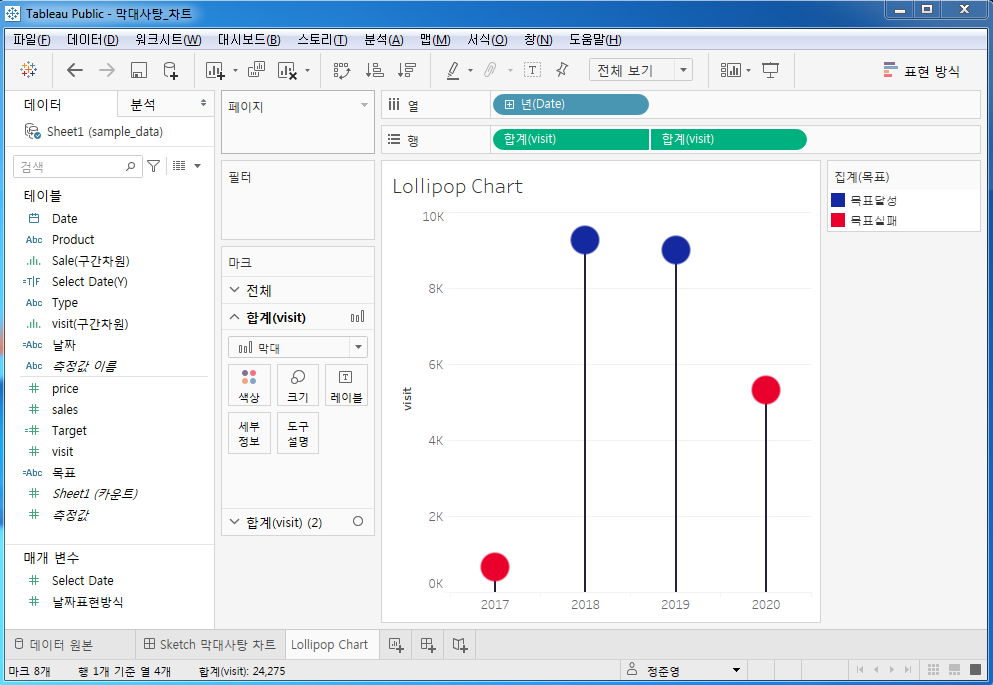 Date Type Product Price Visit Sales 2017-12-31 핫 라떼 4000 132 528000 2017-12-31 핫 아메리카노 3500 117 409500 2017-12-31 아이스 아이스 라떼 4000 145 580000 2017-12-31 아이스 아이스 아메리카노 3500 118 413000 2017-12-31 아이스 포도 주스 4500 133 598500 2017-12-31 아이스 수박 주스 5000 0 0 2018-01-31 핫 라떼 4000 150 600000 2018-01-31 핫 아메리카노 3500 121 423500 2018-01-31 아이스 아이스 라떼 4000 123 492000 2018-01-31 아이스 아이스 아메리카노 3500 111 388500 2018-01-31 아이스 포도 주스 4500 146 657000 2018-01-31 아이스 수박 주스 5000 0 0 Tableau에서 막대사탕 차트 시각화하기