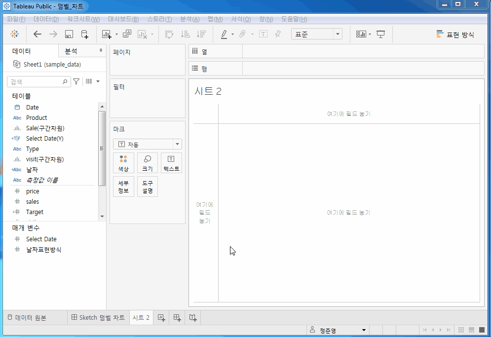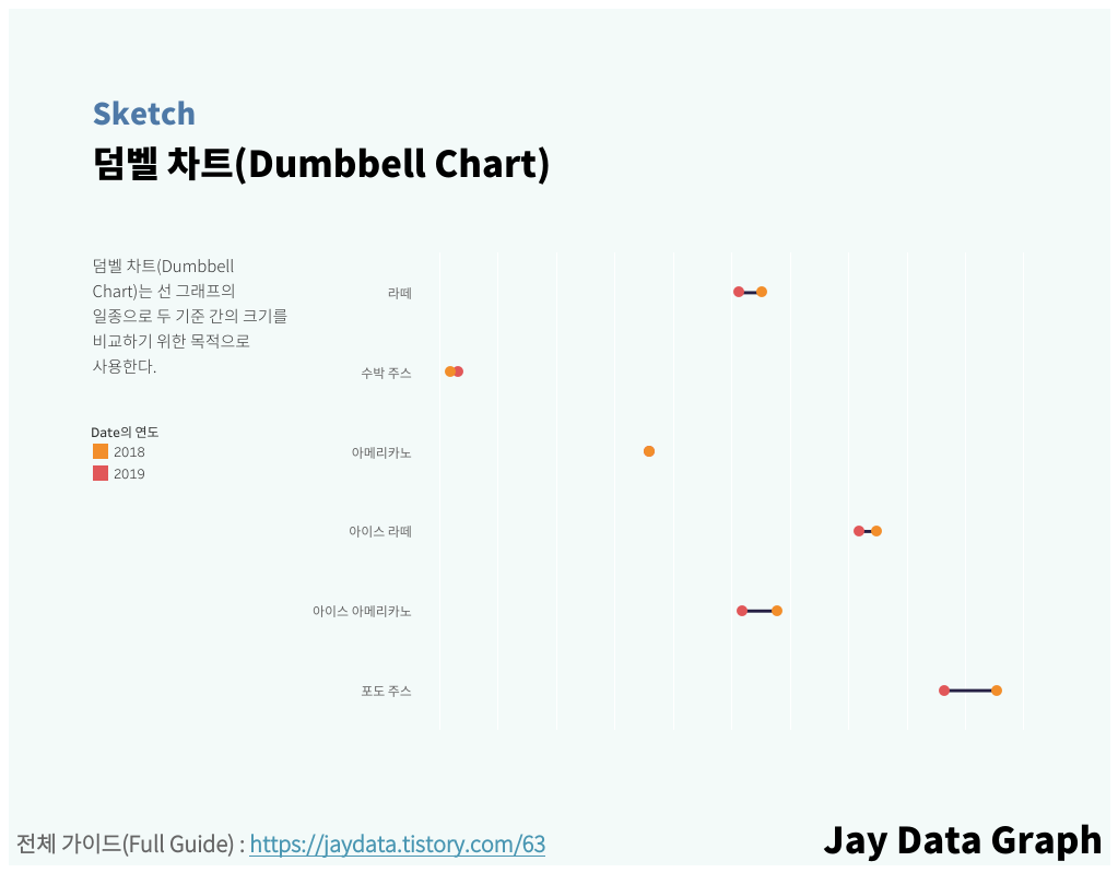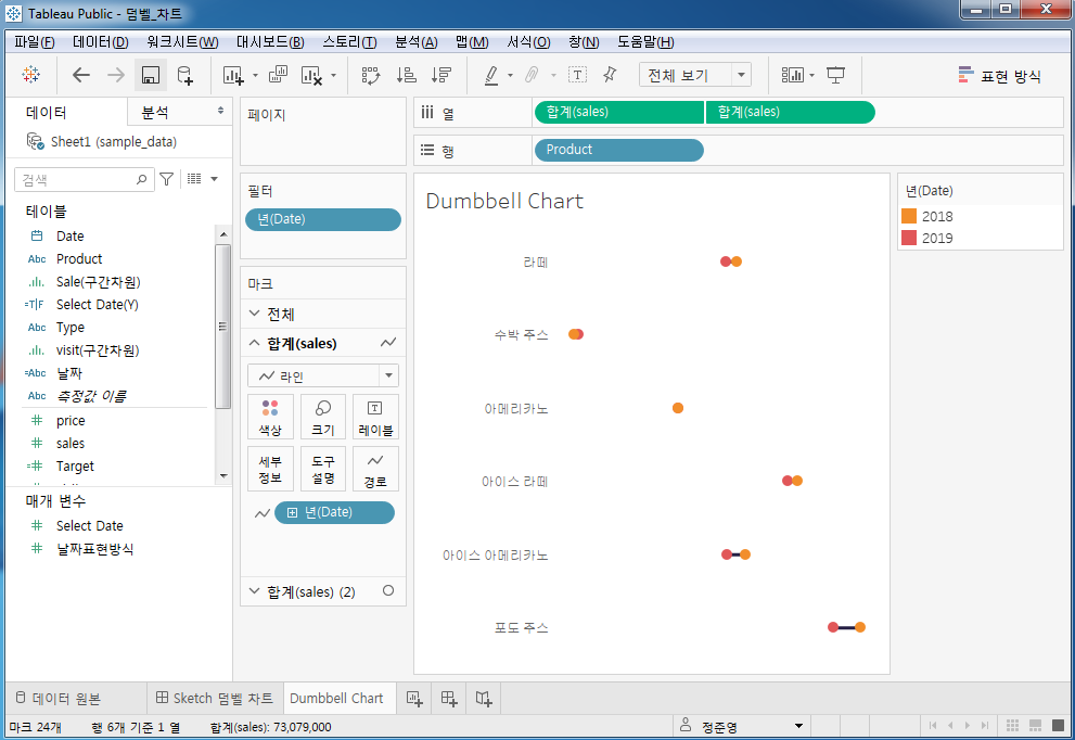 Date Type Product Price Visit Sales 2017-12-31 핫 라떼 4000 132 528000 2017-12-31 핫 아메리카노 3500 117 409500 2017-12-31 아이스 아이스 라떼 4000 145 580000 2017-12-31 아이스 아이스 아메리카노 3500 118 413000 2017-12-31 아이스 포도 주스 4500 133 598500 2017-12-31 아이스 수박 주스 5000 0 0 2018-01-31 핫 라떼 4000 150 600000 2018-01-31 핫 아메리카노 3500 121 423500 2018-01-31 아이스 아이스 라떼 4000 123 492000 2018-01-31 아이스 아이스 아메리카노 3500 111 388500 2018-01-31 아이스 포도 주스 4500 146 657000 2018-01-31 아이스 수박 주스 5000 0 0 Tableau에서 덤벨 차트 시각화하기