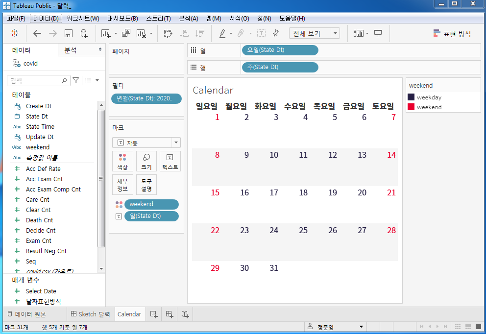 END4. 차원값의 State Dt를 행과 열 그리고 마크 패널의 텍스트로 드래그하고 열에 있는 State Dt는 요일로 변경하고 행에 있는 State Dt는 주로 변경한다. 마크 패널의 텍스트에 있는 State Dt를 일료 변경하면 달력을 쉽게 시각화 할 수 있다.