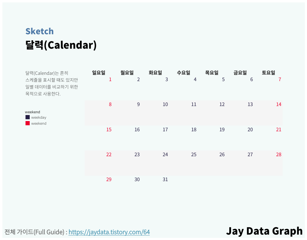달력(Calendar)은 흔히 스케쥴을 표시할 때도 있지만 일별 데이터를 비교하기 위한 목적으로 사용한다. 특히, 우리나라와 같이 계절성이 있기 때문에 1년 52주차의 변화가 눈에 띈다거나 계절성의 영향을 받지 않더라도 주차별로 데이터의 변화를 손쉽게 파악할 수 있으며, 요일별로 함께 교차분석으로 활용하기 적절한 시각화 기법이다. 다만, Tableau에서 달력을 구현하기 위해서는 모든 해당하는 날의 날짜 데이터가 반드시 있어야 한다. 이는 불필요한 데이터를 축적해야 한다는 단점을 가지고 있다.