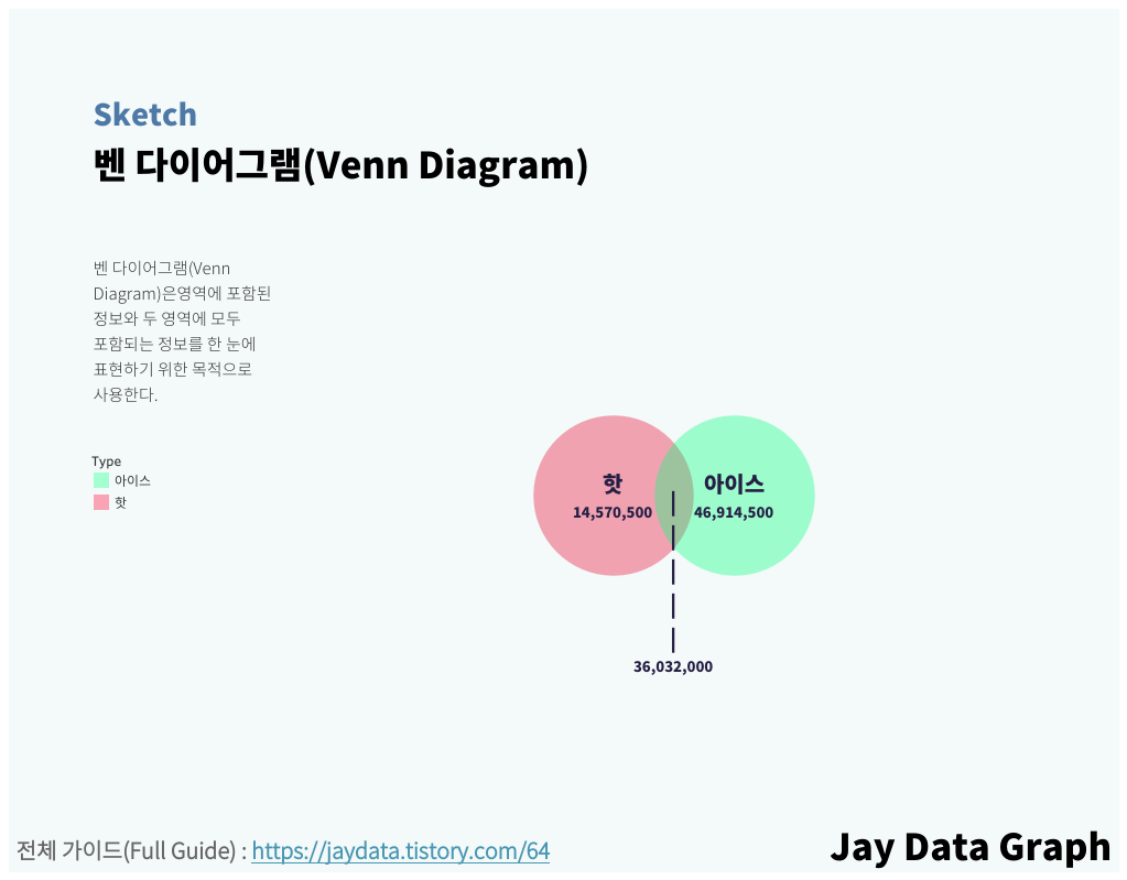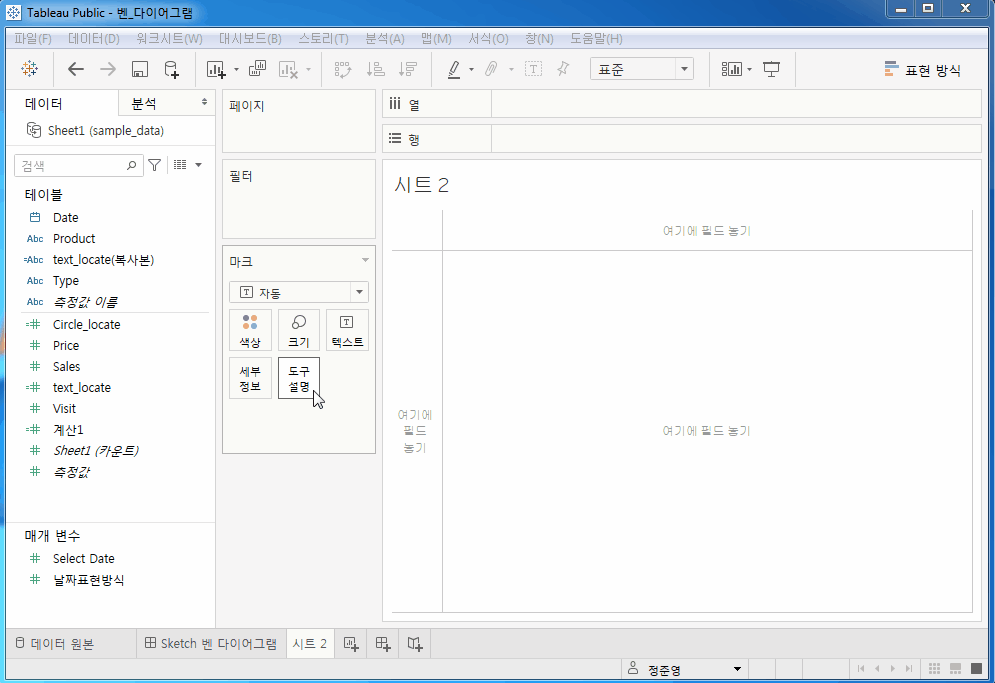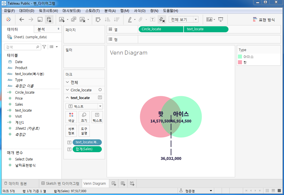 Date Type Product Price Visit Sales 2017-12-31 핫 라떼 4000 132 528000 2017-12-31 핫 아메리카노 3500 117 409500 2017-12-31 아이스 아이스 라떼 4000 145 580000 2017-12-31 아이스 아이스 아메리카노 3500 118 413000 2017-12-31 아이스 포도 주스 4500 133 598500 2017-12-31 아이스 수박 주스 5000 0 0 2018-01-31 핫 라떼 4000 150 600000 2018-01-31 핫 아메리카노 3500 121 423500 2018-01-31 아이스 아이스 라떼 4000 123 492000 2018-01-31 아이스 아이스 아메리카노 3500 111 388500 2018-01-31 아이스 포도 주스 4500 146 657000 2018-01-31 아이스 수박 주스 5000 0 0 Tableau에서 벤 다이어그램 시각화하기