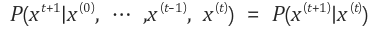 이때 확률 변수 X가 아래와 같은 식을 만족한 경우 Markov Chain(마코프 연쇄)라고 한다. 이 관계식은 0번째 시점부터 t번째 시점까지의 모든 사건이 존재할 경우, t번째 사건은 t-1번째 사전에만 영향을 받는다는 뜻이다. 즉, 한 상태에서 다른 상태로 전이(Transition)을 하는 동안 과거의모든 전이 확률(Transition Probability)가 필요한 것이 아닌 바로 직전의 확률로 추정할 수 있다.