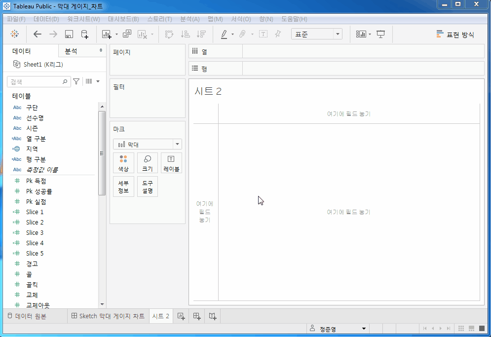 구단 선수명 시즌 출장 골 어시스트 슈팅 강원FC 가솔현 2020 0 0 0 0 광주FC 김태곤 2020 0 0 0 0 대구FC 고태규 2020 0 0 0 0 부산아이파크 박경민 2020 0 0 0 0 상주상무 박지민 2020 0 0 0 0 서울FC 김원균 2020 0 0 0 0 성남FC 김근배 2020 0 0 0 0 수원삼성 안찬기 2020 0 0 0 0 울산현대 김민덕 2020 0 0 0 0 인천유나이티드 김유성 2020 0 0 0 0 전북현대 김정훈 2020 0 0 0 0 포항스틸러스 김주환 2020 0 0 0 0 Tableau에서 막대 게이지 차트 시각화하기