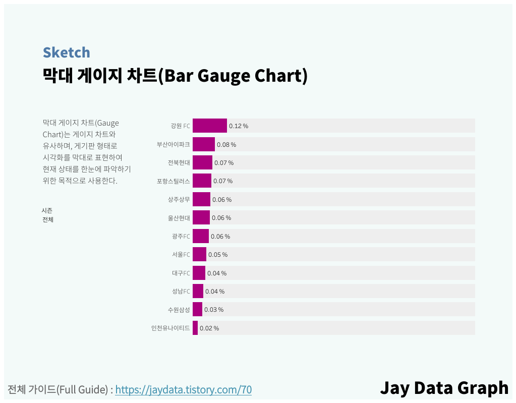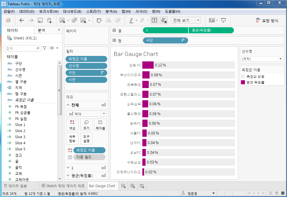 구단 선수명 시즌 출장 골 어시스트 슈팅 강원FC 가솔현 2020 0 0 0 0 광주FC 김태곤 2020 0 0 0 0 대구FC 고태규 2020 0 0 0 0 부산아이파크 박경민 2020 0 0 0 0 상주상무 박지민 2020 0 0 0 0 서울FC 김원균 2020 0 0 0 0 성남FC 김근배 2020 0 0 0 0 수원삼성 안찬기 2020 0 0 0 0 울산현대 김민덕 2020 0 0 0 0 인천유나이티드 김유성 2020 0 0 0 0 전북현대 김정훈 2020 0 0 0 0 포항스틸러스 김주환 2020 0 0 0 0 Tableau에서 막대 게이지 차트 시각화하기