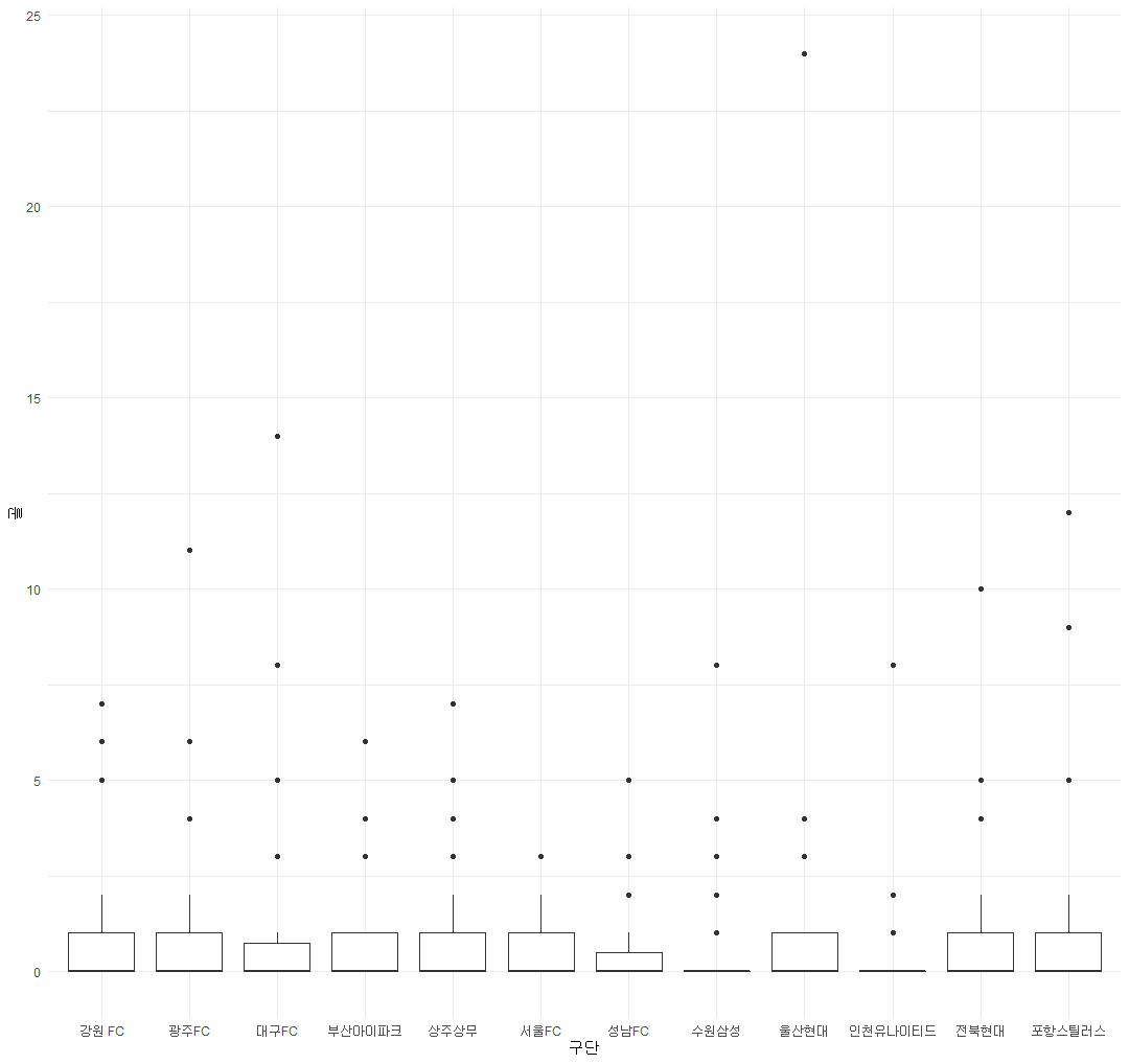 ###Box Plot을 이용하여 데이터 시각화 ggplot(k_league, aes(구단)) + geom_boxplot(aes(y = 골)) + theme_minimal()