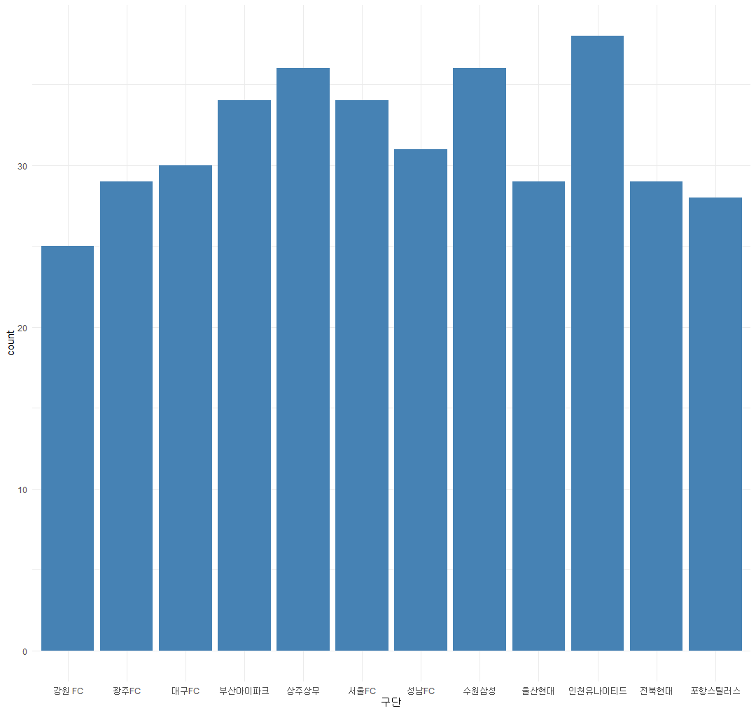 library(xlsx) library(ggplot2) ###excel 파일로드 k_league = read.xlsx("K리그.xlsx", sheetIndex = 1, encoding = "UTF-8", as.data.frame = T) ###ggplot2를 활용한 데이터 시각화 ggplot(k_league, aes(구단)) + geom_bar(fill = "steelblue") + theme_minimal()