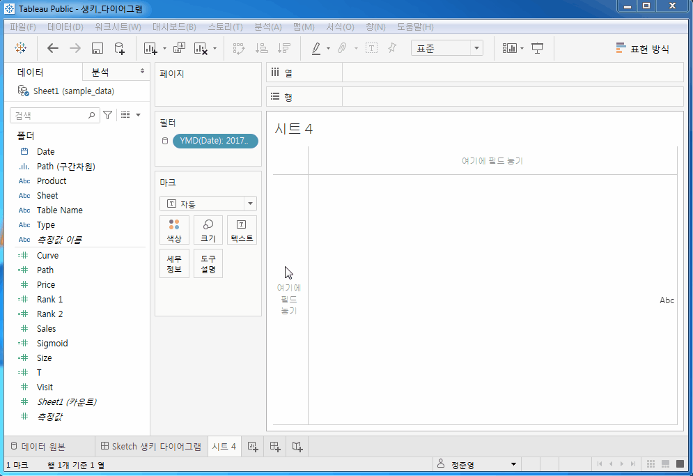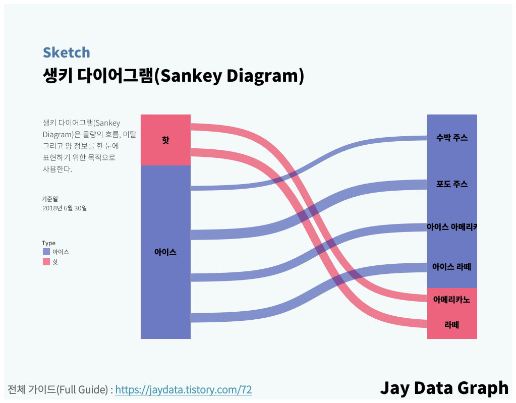 Date Type Product Price Visit Sales 2017-12-31 핫 라떼 4000 132 528000 2017-12-31 핫 아메리카노 3500 117 409500 2017-12-31 아이스 아이스 라떼 4000 145 580000 2017-12-31 아이스 아이스 아메리카노 3500 118 413000 2017-12-31 아이스 포도 주스 4500 133 598500 2017-12-31 아이스 수박 주스 5000 0 0 2018-01-31 핫 라떼 4000 150 600000 2018-01-31 핫 아메리카노 3500 121 423500 2018-01-31 아이스 아이스 라떼 4000 123 492000 2018-01-31 아이스 아이스 아메리카노 3500 111 388500 2018-01-31 아이스 포도 주스 4500 146 657000 2018-01-31 아이스 수박 주스 5000 0 0 Tableau에서 생키 다이어그램 시각화하기