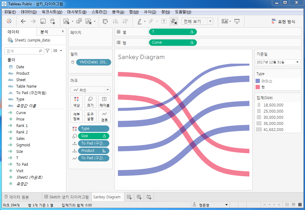 Date Type Product Price Visit Sales 2017-12-31 핫 라떼 4000 132 528000 2017-12-31 핫 아메리카노 3500 117 409500 2017-12-31 아이스 아이스 라떼 4000 145 580000 2017-12-31 아이스 아이스 아메리카노 3500 118 413000 2017-12-31 아이스 포도 주스 4500 133 598500 2017-12-31 아이스 수박 주스 5000 0 0 2018-01-31 핫 라떼 4000 150 600000 2018-01-31 핫 아메리카노 3500 121 423500 2018-01-31 아이스 아이스 라떼 4000 123 492000 2018-01-31 아이스 아이스 아메리카노 3500 111 388500 2018-01-31 아이스 포도 주스 4500 146 657000 2018-01-31 아이스 수박 주스 5000 0 0 Tableau에서 생키 다이어그램 시각화하기