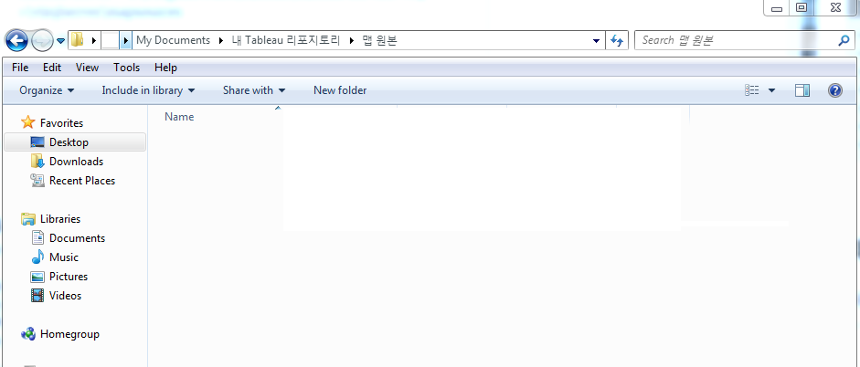 새로 만든 .tms 파일을 태블로에서 불러오기 위해서, "Local ID > My Documents > 내 Tableau 리포지토리 > 맵 원본" 디렉토리로 이동하여 해당 파일을 복사한다. 다음으로 태블로 데스크탑을 실행시키고 상단의 메뉴 탭에서 "맵 > 배경 맵"을 선택한 다음 배경 맵을 맵 원본 디렉토리에서 찾아서 선택한다.