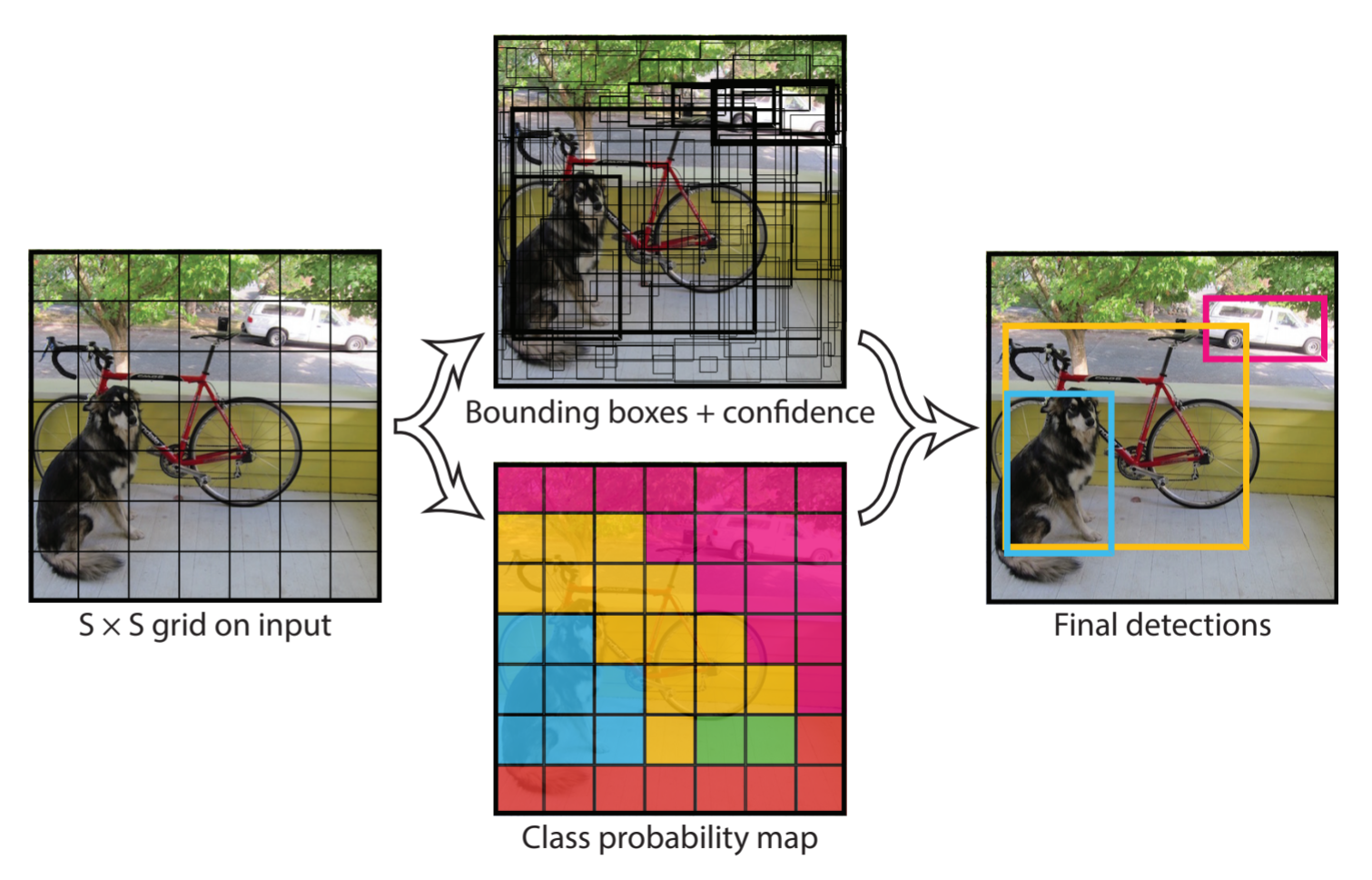 YOLO는 s×s 조각의 이미지를 자르고 각 각의 조각에서 바운딩 되는 영역과 개체 확률 지도를 조합하여 [그림 2]와 같은 최종 결과물을 생성한다.