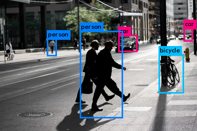 [그림 4] 이미지 디텍팅 결과 Joseph이 제안한 YOLO를 R에서 이용해보았다. 비록 단 한장의 사진을 가지고 처리하였다. 그 결과 이미지 디텍션을 빠른 속도로 제공하고 있으며, 향후에는 영상 데이터를 활용해서 태깅하는 것을 테스트해볼 필요가 있다. 뿐만 아니라 다른 알고리즘과도 비교해서 어떤 상황에서 어떤 알고리즘이 더 좋을지 비교해보는 것 도 필요하다.