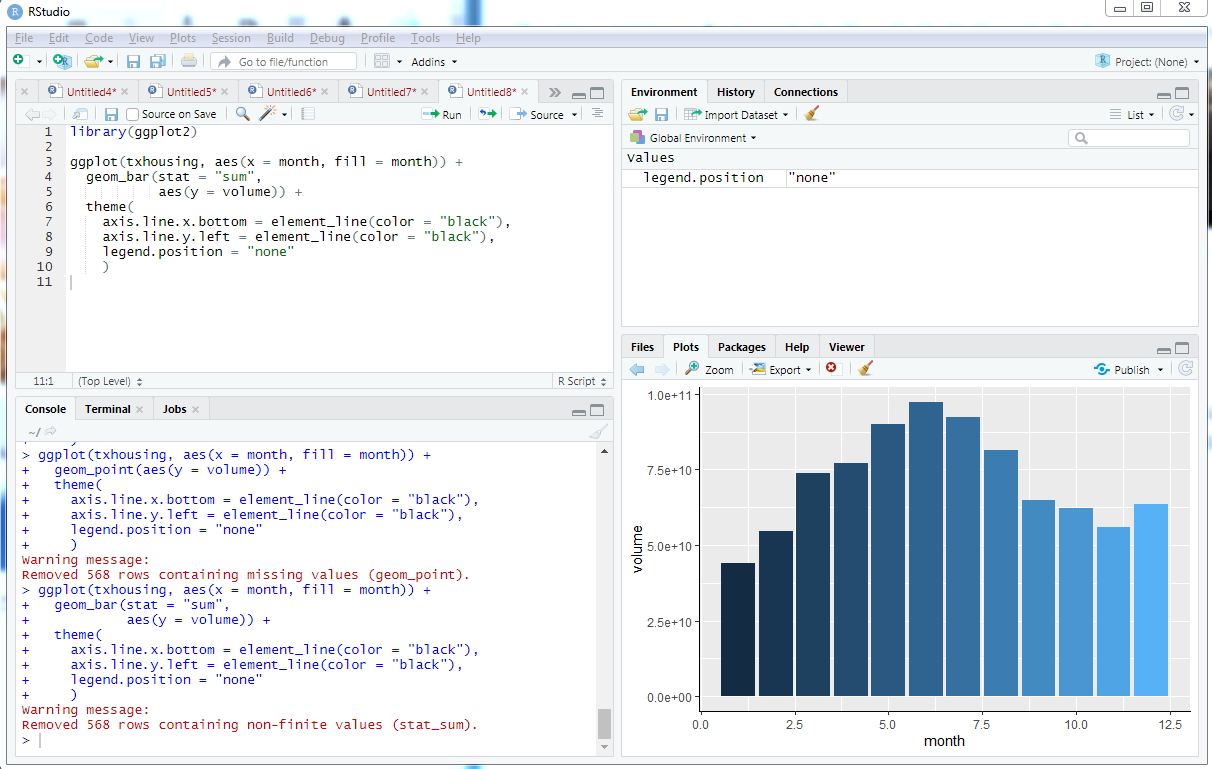 통계 분석 프로그램으로 유명한 R은 SAS, SPSS와 다르게 오픈소스인 점에서 비교적 최근에 수요가 폭증했다. 기업에서도 무료로 사용할 수 있기 때문에 도입이 빠르게 이루어졌으며, 이와 관련한 교육들도 상당히 많이 생기고 있다. S 언어를 기반로 만들어졌으며 통계과 시각화에 특화되어 있다. [그림 2]의 왼쪽 윗 부분이 코딩을 수행하는 곳이며, 주변에 결과가 도출된다.