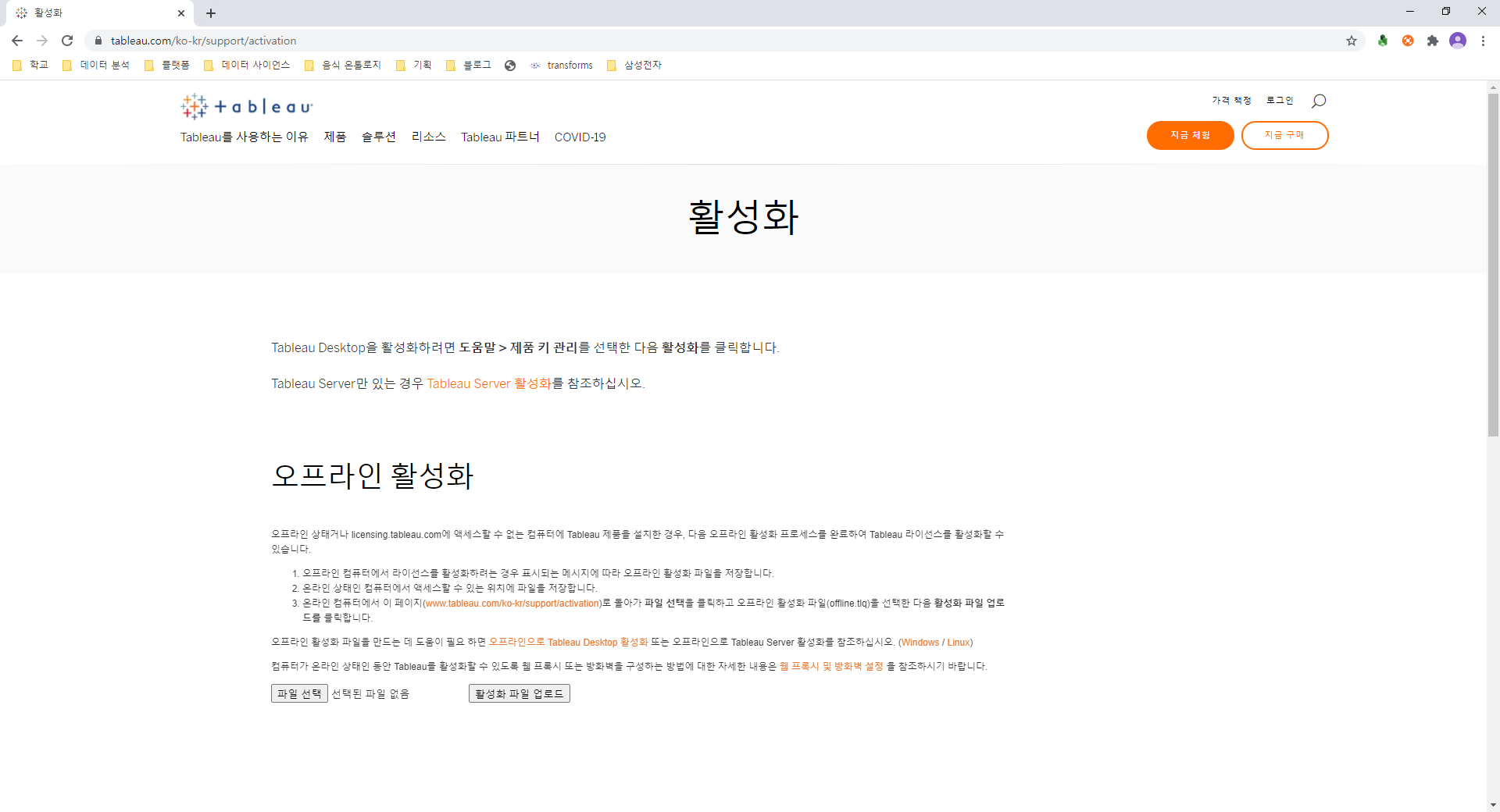 [그림 5] Tableau 공식 사이트 활성화 페이지 [그림 6]과 같이 오프라인 활성화 아래에 "활성화되었습니다. 활성화 파일을 클릭하여 여기 다운로드하십시오."의 여기를 클릭하고 activation.tlf 파일을 저장한다. activation.tlq 파일을 더블클릭해서 실행하면 정상적으로 활성화해서 Tableau를 사용할 수 있다.