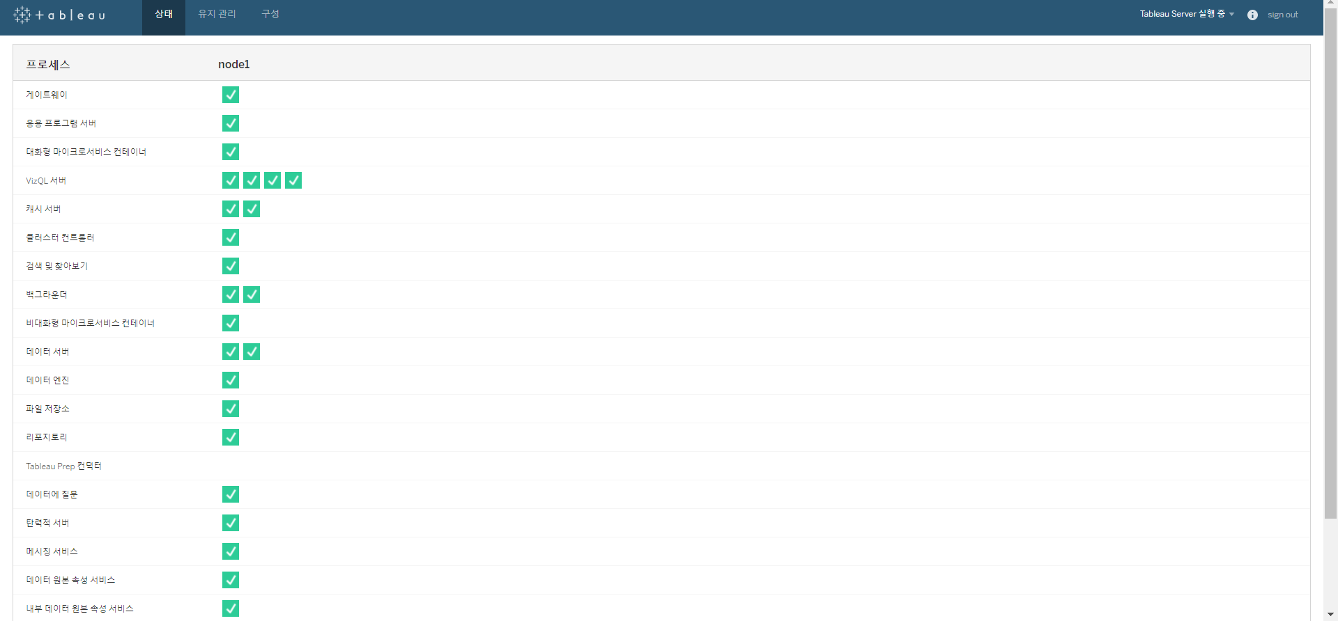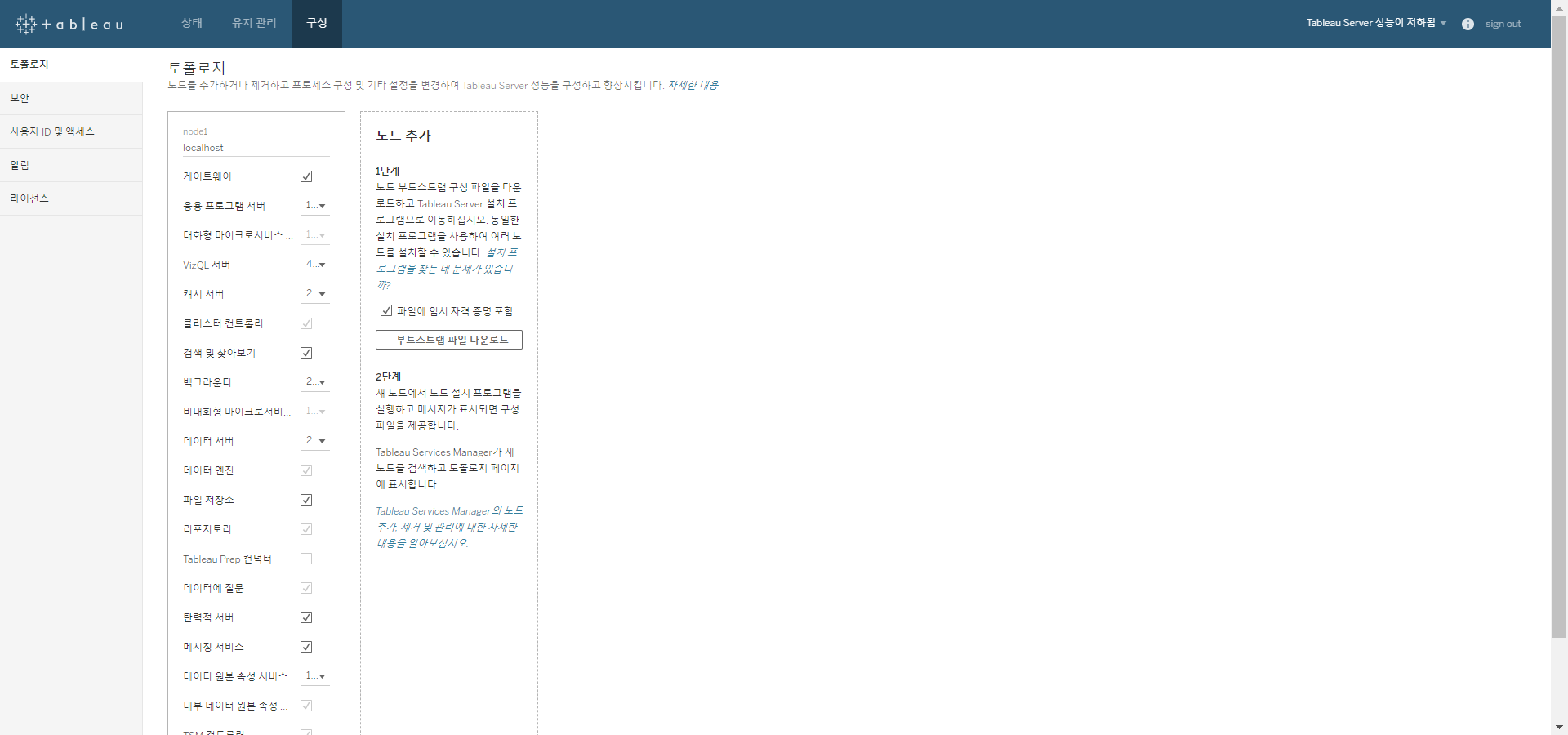 [그림 1] Tableau 서비스 관리자 로그인 창(localhost:8850) 로그인 하면 Tableau 서버의 상태가 나타난다. 최초에 설치하면 메일 구독을 설정을 추가로 해주어야 한다. 메일 구독 설정은 상단에 있는 메뉴탭의 구성에서 설정할 수 있다.