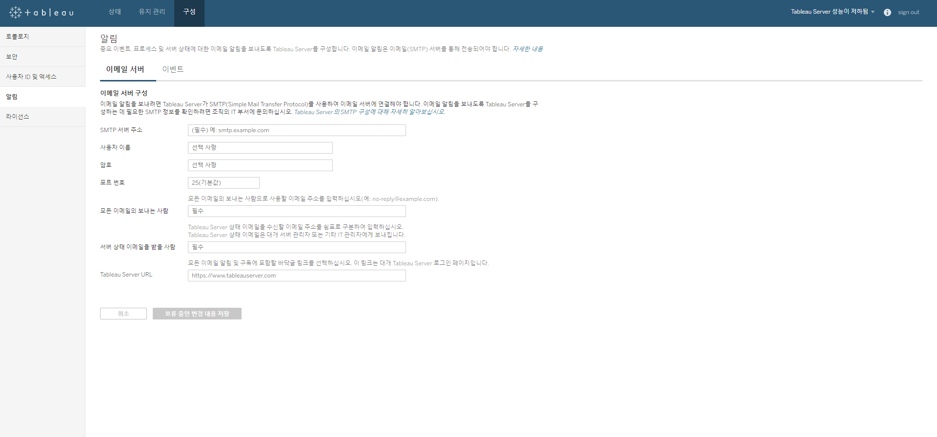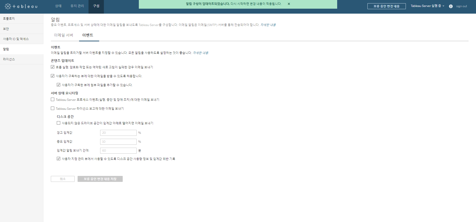 [그림 4] 이메일 서버 설정 이벤트 설정에서는 콘텐츠 업데이트항목에서 "사용자가 구독하는 뷰에 대한 이메일을 받을 수 있도록 허용합니다." 체크 박스를 선택하고 서버를 재기동 한다. 서버 재기동을 우측 상단에 위치한 Tableau Server 실행 중을 클릭하면 서버를 재기동 할 수 있다.