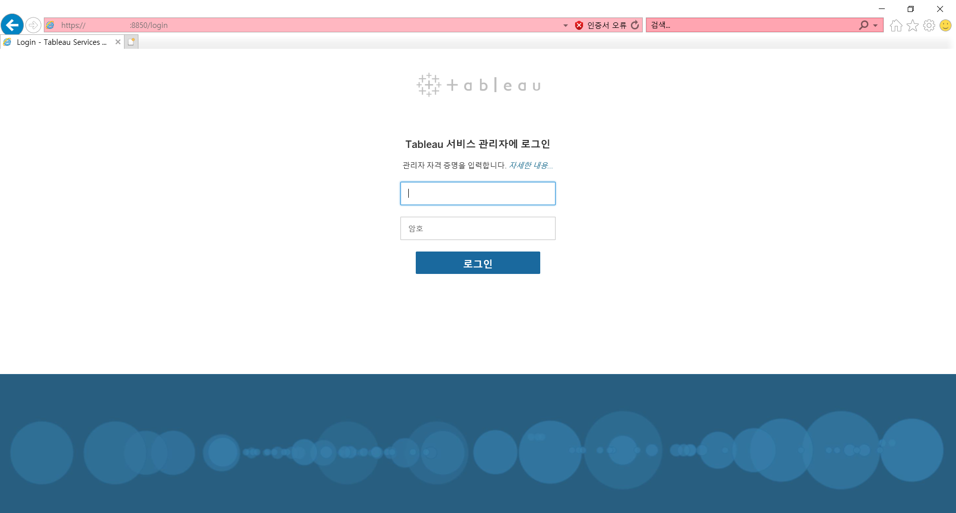 구축된 대시보드를 이메일로 전달하기 위해서 설정이 필요하다. Tableau 서버가 설치된 곳의 8850포트로 접속하고 Tableau 서비스 관리자에 로그인한다. 아이디와 패스워드는 최초에 Tableau 서버를 설치할 때 생성한 계정으로 대시보드를 게시하는 8080 포트와는 다른 계정이다.