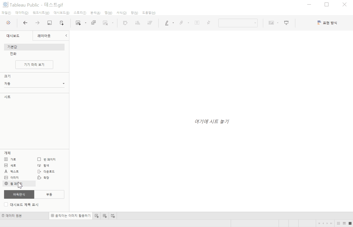 2. Tableau에서는 대시보드를 구성할 수 있는 다양한 개체를 제공한다. 가로, 세로 컨테이너와 빈 페이지, 탐색 버튼, 텍스트, 다운로드, 이미지, 확장, 웹 페이지로 구성되어 있다. 이미지를 이용해서 gif 파일을 가져다 둘 경우에는 정지된 상태로만 보여진다. 따라서 이 방법으로는 움직이는 모습을 표현할 수 없고 웹 페이지를 이용할 것이다.