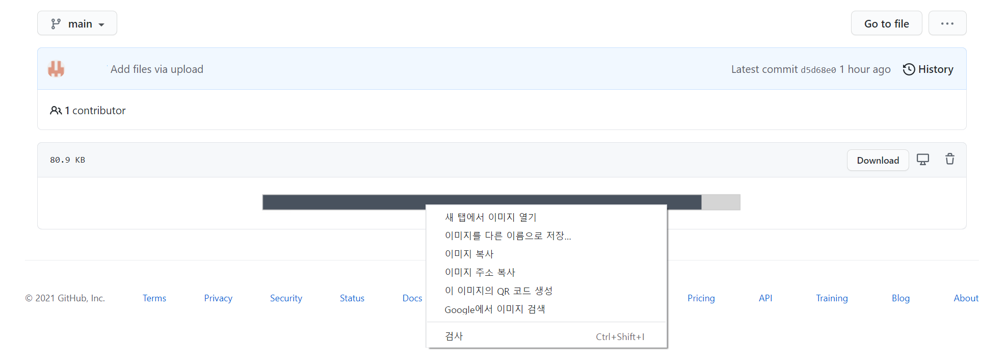 [그림 3] github에 gif 파일 업로드 4. github에 업로드한 파일을 클릭해서 나온 화면이 그림 4이다. 이때 상단 주소창에 표시된 URL을 복사할 경우 Tableau에 github 화면 전체가 임베딩이 된다. 움직이는 이미지 위에 마우스를 올리고 오른쪽 버튼을 클릭하여 나타나는 팝업 창에서 '이미지 주소 복사'를 클릭한다.