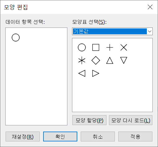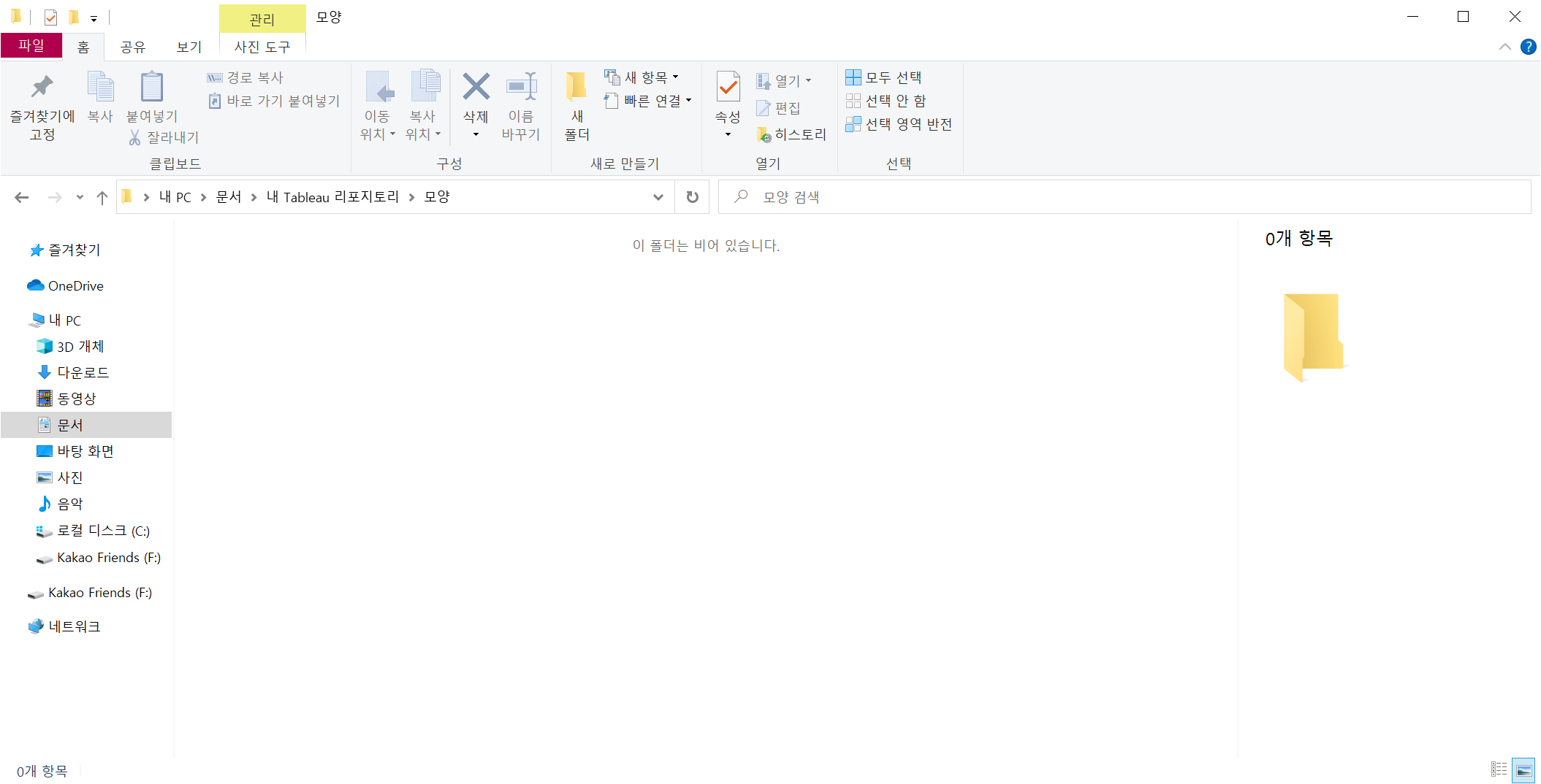 [그림 2] 비어있는 Tableau 모양 저장소 [그림 3]과 같이 준비된 icon을 모양 저장소에 옮겨서 불러오면 대시보드를 구성하기 위한 아이콘 준비가 완료되었다. [그림 1] Tableau 모양 편집에서 재설정(R)을 누를 경우에는 할당한 아이콘을 전부 초기화 할 수 있다.