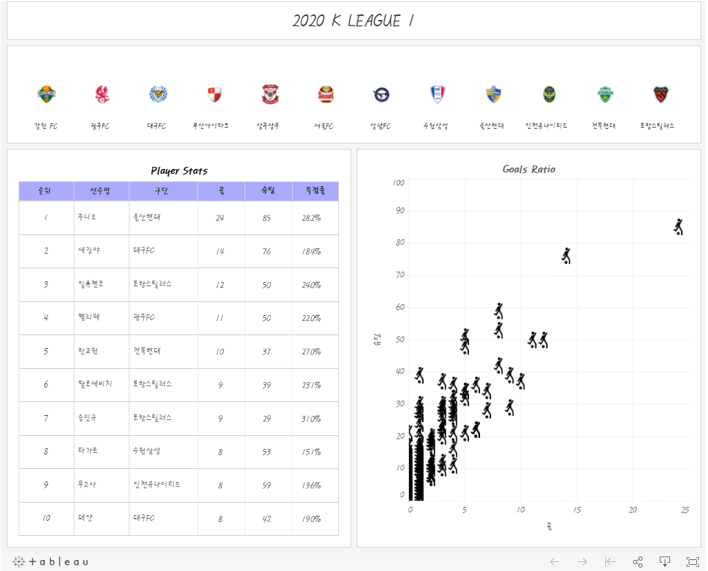 2020시즌 K 리그 1 시즌 종료 후 선수들의 개인 기록 정보를 수집하여 간단하게 대시보드를 구성한 결과이다. 득점이 높은 선수가 어떤 선수인지 확인하기 위한 대시보드로 2020년에는 울산현대의 주니오 선수가 득점왕이었다. 슈팅 당 득점률은 무려 28.2%로 4번 찼을 경우 1회 이상은 득점으로 이어졌다고 할 수 있다. 좀 더 자세하게 분석을 하기 위해 구단 별로 어떤 선수들이 득점 순위가 높으며, 양질의 득점을 했는지 확인하기 위해 상단에 버튼을 생성하였다. 구단 앰블럼을 아이콘으로 활용하여 생성하였고 관련 데이터는 K 리그 포탈에서 수집하였으며, 앰블럼은 네이버 스포츠의 구단/협회 탭의 이미지를 활용하였다.