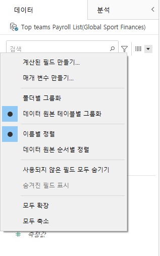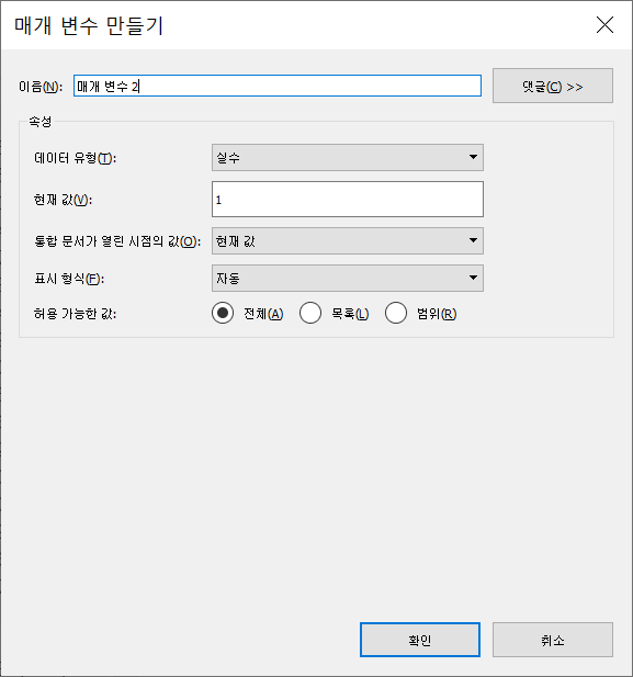 1. [그림 2]와 같이 데이터 패널의 상단에 삼각형 버튼을 클릭하면 나타나는 팝업 창에서 '매개 변수 만들기...'을 클릭한다. 단, 데이터 패널에서 오른쪽 버튼을 클릭하여도 동일한 팝업이 나타난다.