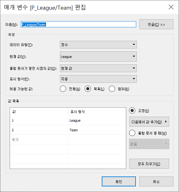 매개 변수를 생성한다고 하더라도 바로 활용을 할 수 없다. Tableau에서 매개 변수를 사용하기 위해 해당 버튼을 클릭하면 조건에 맞게 필터가 될 수 있도록 조건식을 생성해야 한다. 앞에서 생성한 매개 변수인 'P_League/Team'은 1일 경우에 League를 보여줄 것이고 2일 경우에는 Team을 보여줄 것이다.