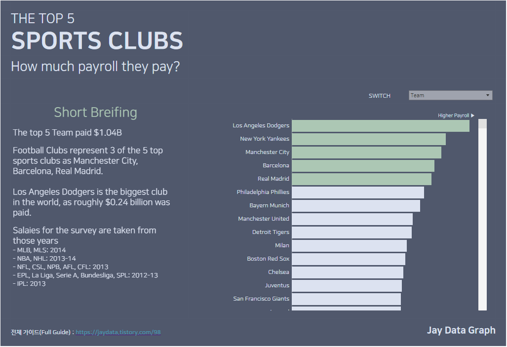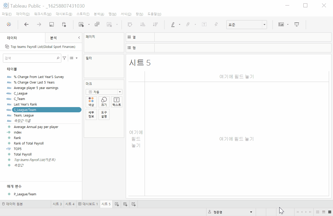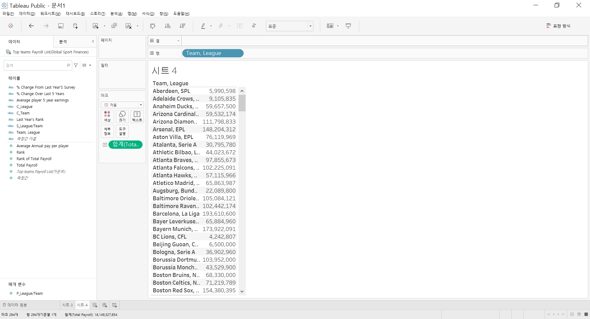 앞에서 생성한 매개 변수와 차원을 이용해서 화면을 구성해본다. S_League/Team을 행 선반에 옮기고 Total Payroll을 열 선반으로 옮기면 막대 그래프가 나타난다. 상단의 내림차순 버튼을 클릭하여 지출이 많은 순으로 정렬한다. 매개 변수가 잘 동작을 하고 있는지 확인하기 위해 매개 변수를 표시하고 버튼을 클릭해보자
